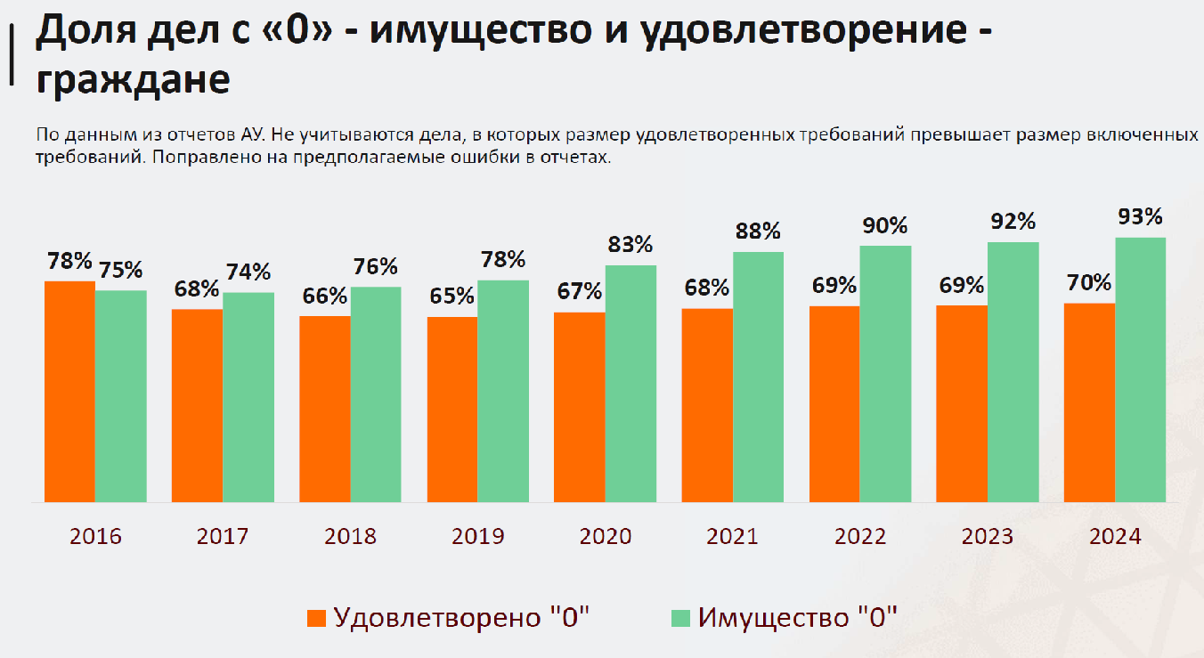 Как и предыдущие годы, 2024 показал, что по результатам банкротства чаще выигрывают должники. В 70% судебных процессов кредиторы не получили из конкурсной массы ни копейки, в 93% – у банкротов не изъяли никакое имущество. В итоге было удовлетворено всего 5,5% требований кредиторов, заявленных в реестры.